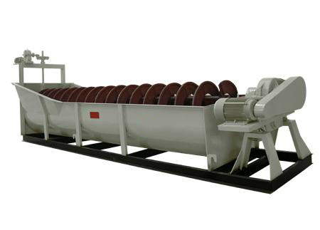 洗砂机工作时,电机通过三角带、减速机、齿轮减速后带动叶轮缓慢转动,砂石有给料槽进入洗槽中,在叶轮的带动下翻滚,并互相研磨,除去覆盖
